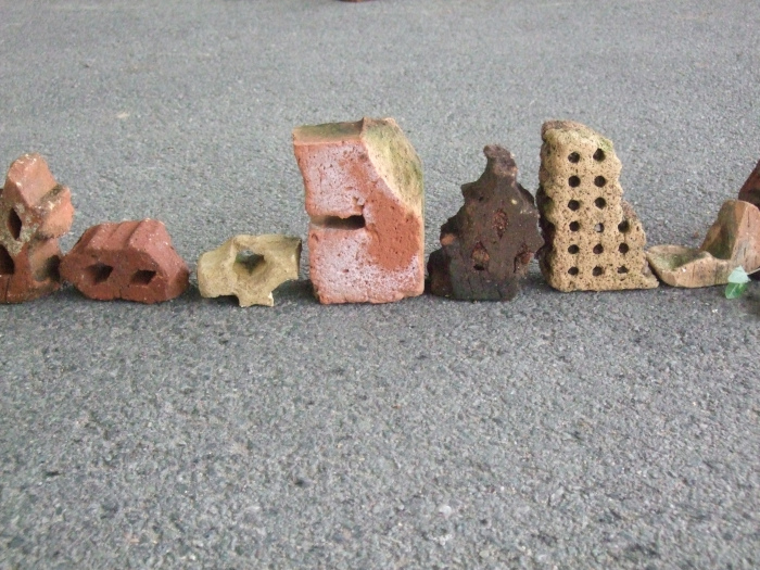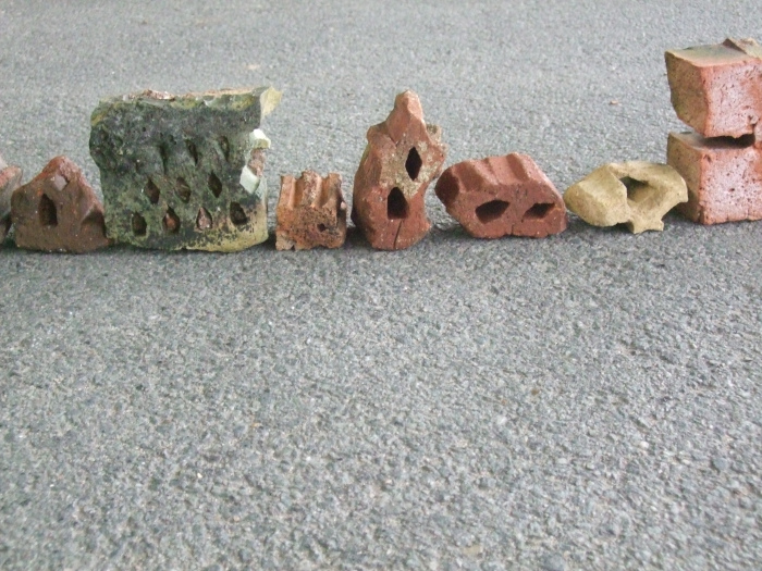 Men på strandbredden neden for teglværket fandt jeg stumper og brokker af forskellige tiders former for tegl nedbrudte af vand og vejr. Og det blev grundlaget for mit færdige projekt.