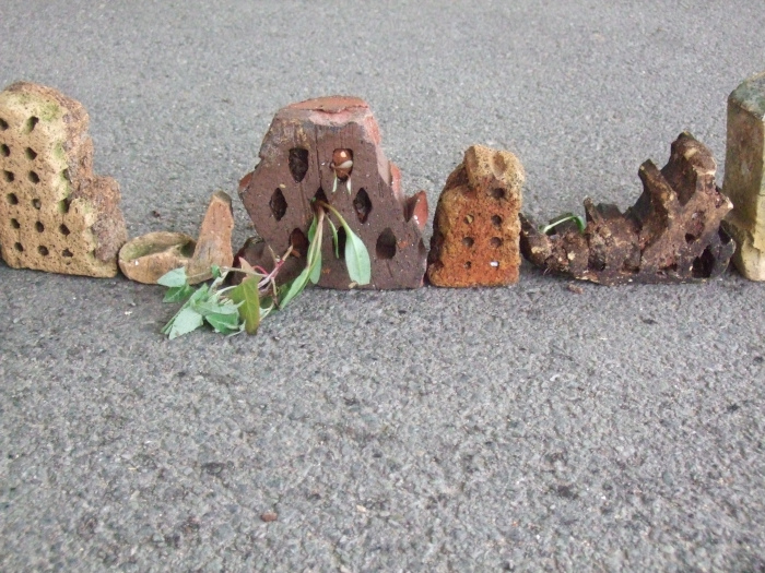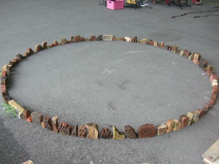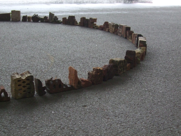 Dette består af en opstilling af 100 stykker tegl placeret i en cirkel. Jeg har arbejdet med sammensætning og rytme – form og mellemrum, som bygninger, skrifttegn eller noder – udsagn og pauser. Med genstande, der oprindeligt har haft fælles form og materiale, men er smidt væk og med tiden er nedbrudt, omformet og deformeret – og nu genfundet og anvendt.